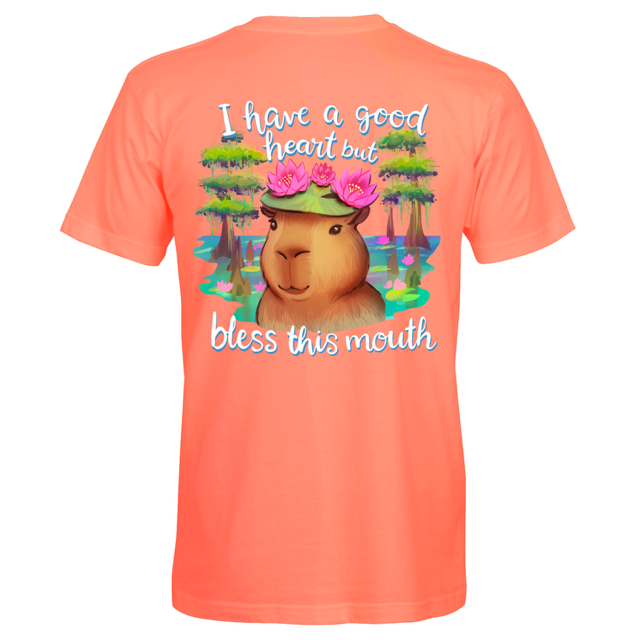 Good heart, questionable mouth? This bright coral tee featuring an adorable capybara gets it. Perfect for anyone who means well but can't help saying exactly what they're thinking. The cute cappy design adds charm to your honest personality, making it clear you've got good intentions—even if your words sometimes need a filter. Wear it proud and let people know what they're getting into.